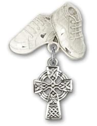 Sterling Silver Baby Badge with Celtic Cross Charm and Baby Boots Pin